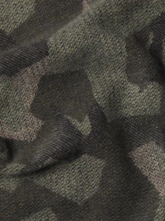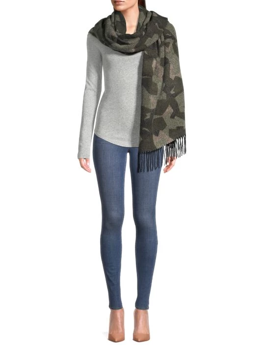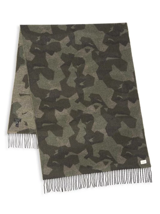 Lightweight wool scarf showcasing a unique camouflage print finished with twisted fringe trim.