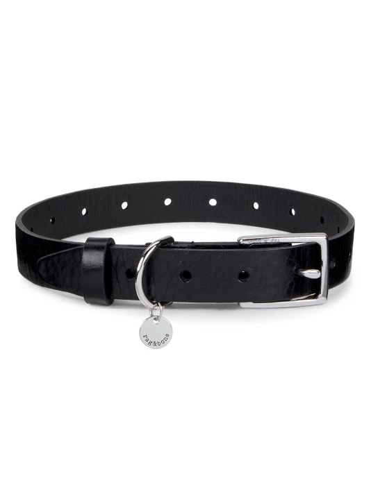 A snake-embossed leather dog collar with an adjustable buckle and a logo charm.