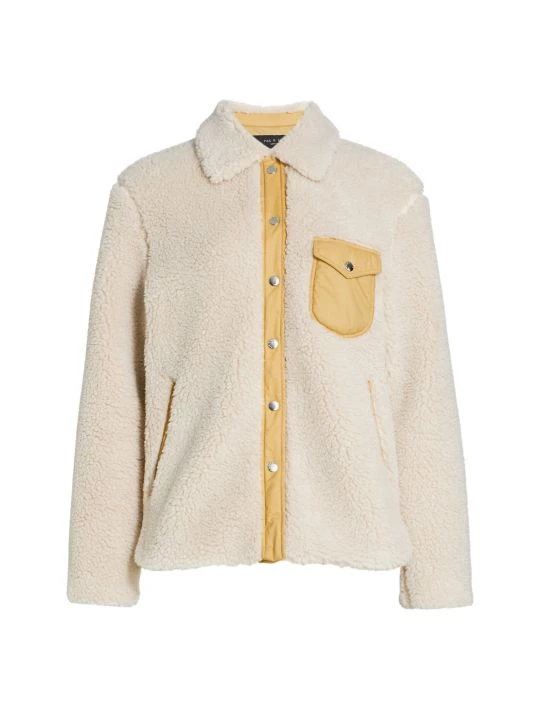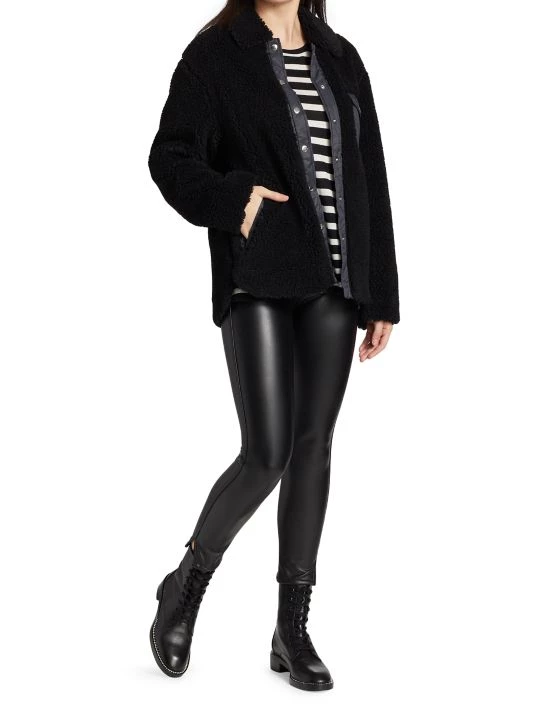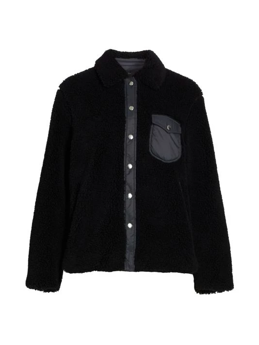 This shacket is crafted of soft sherpa with a glossy patch pocket and placket.