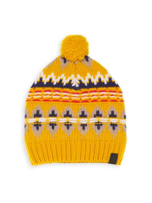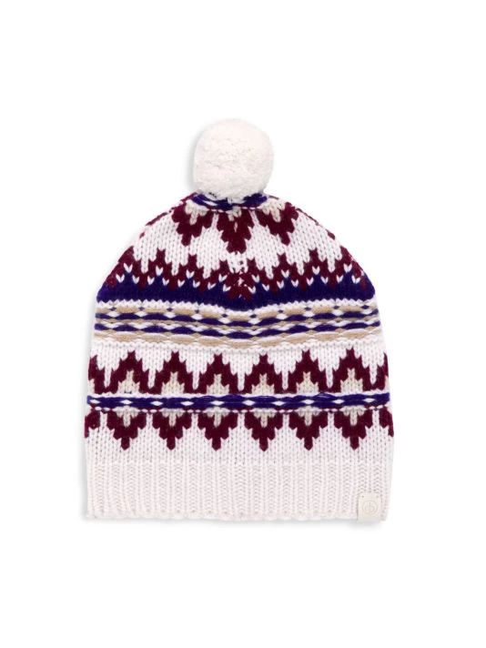 This classic heritage beanie in a novelty Fair Isle stitch features a branded logo patch at the ribbed trim, topped with a playful pom-pom.