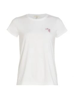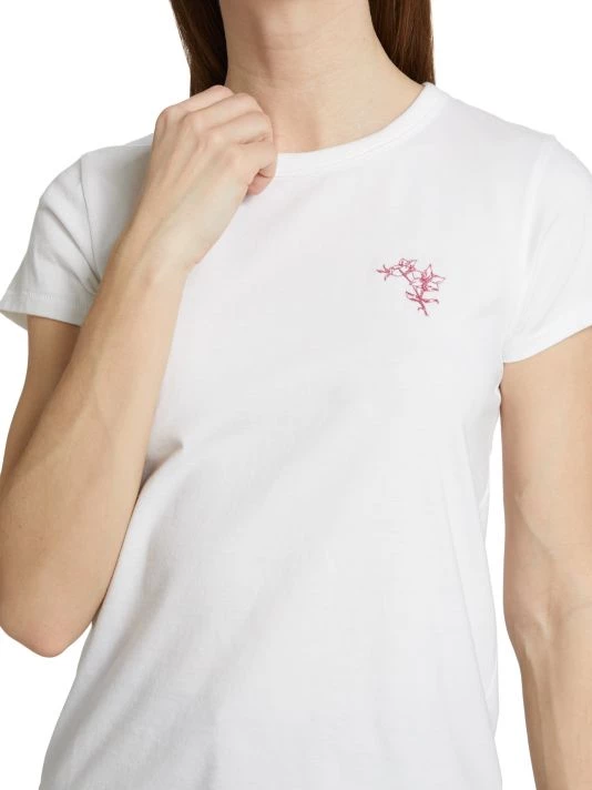 Crafted of cotton, this t-shirt is adorned with a floral decal at the left upper chest.