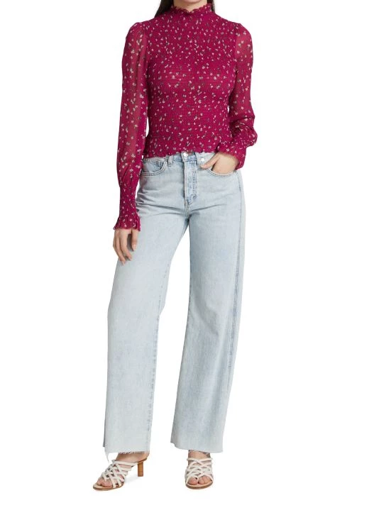 This charming smocked blouse blooms with a bright floral print finished with the ruffled neck.