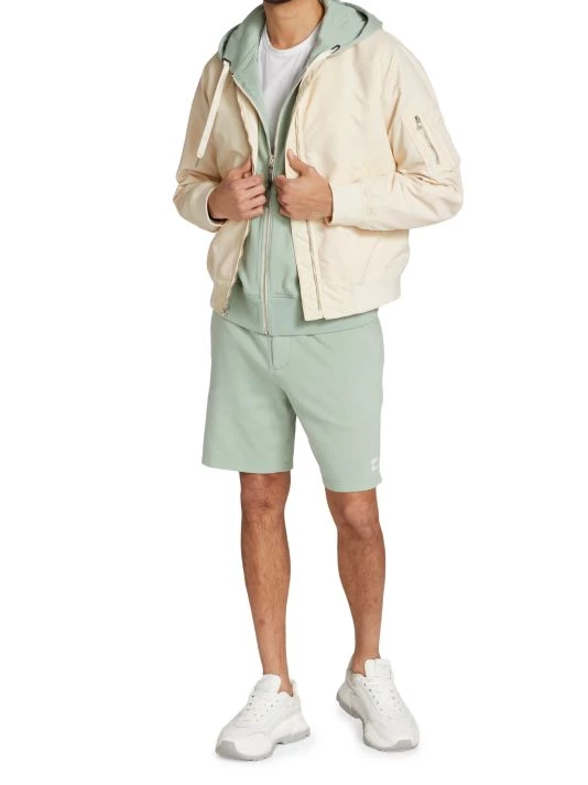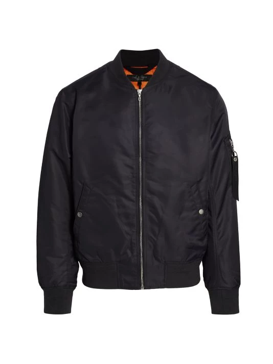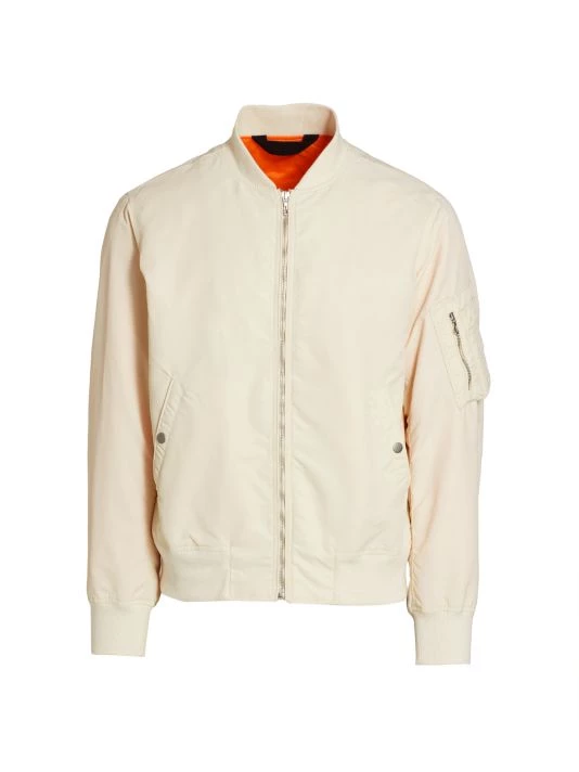 Made of nylon, this oversized bomber jacket is adorned with snap slip pockets at the sides and a zippered pocket on the left sleeve.