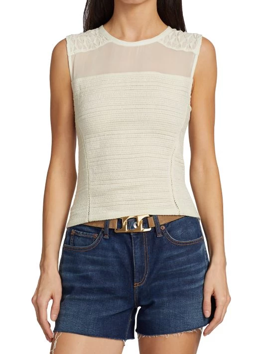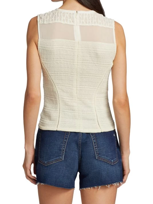 Embroidered detailing shapes this fitted shell, topped with a sheer yoke.